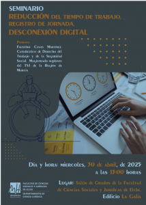 El próximo miércoles, 30 de abril de 2025, a las 13:00 horas, se celebrará en el Salón de Grados de la Facultad de Ciencias Sociales y Jurídicas de Elche (Edificio La Galia) el seminario titulado: “Reducción del tiempo de trabajo, registro de jornada, desconexión digital”.