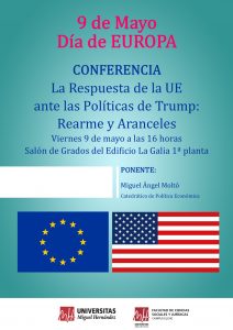 Con motivo del Día de Europa, el próximo viernes 9 de mayo a las 16:00 horas se celebrará en la Universidad Miguel Hernández (UMH) de Elche una conferencia titulada «La Respuesta de la UE ante las Políticas de Trump: Rearme y Aranceles». El acto tendrá lugar en el Salón de Grados del Edificio La Galia (1ª planta).